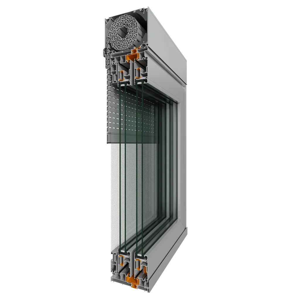 Dritare dopje me rrëshqitje horizontale me futje në mur me takim kokë më kokë, me rrjetë insektesh dhe grilë